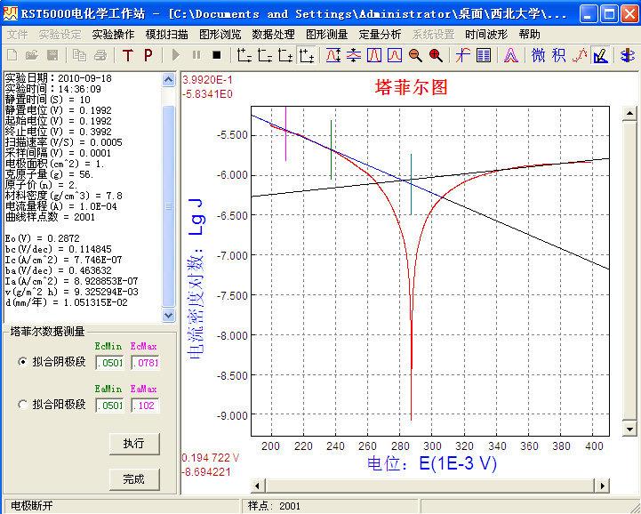 如果設(shè)置參數(shù)不好做出來(lái)的圖從直觀上明顯不對(duì),可以手動(dòng)校正,方法:點(diǎn)擊擬合陰、陽(yáng)極段,就可以對(duì)陰極曲線或陰極曲線進(jìn)行手動(dòng)擬合,其值也自動(dòng)在設(shè)置欄下面顯示。雙擊y軸數(shù)值,作圖的電流密度對(duì)數(shù)和電流密度可以互相轉(zhuǎn)換,