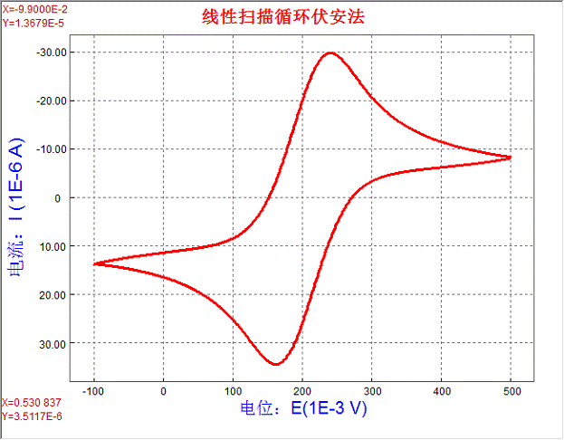 鐵氰化鉀體系(Fe(CN)63-/4-)在中性水溶液中的電化學(xué)行為是一個(gè)可逆過程,其氧化、還原峰對稱,兩峰的電流值相等,峰峰電位差理論值為59mV。體系本身很穩(wěn)定,通常被用于檢測電極和儀器。