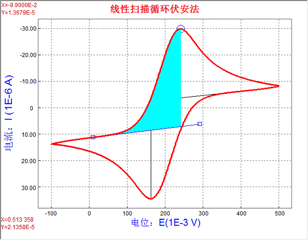 2. 即第三和第四段曲線,根據(jù)循環(huán)伏安曲線特點(diǎn),用半峰法進(jìn)行峰測量,測量結(jié)果如圖: