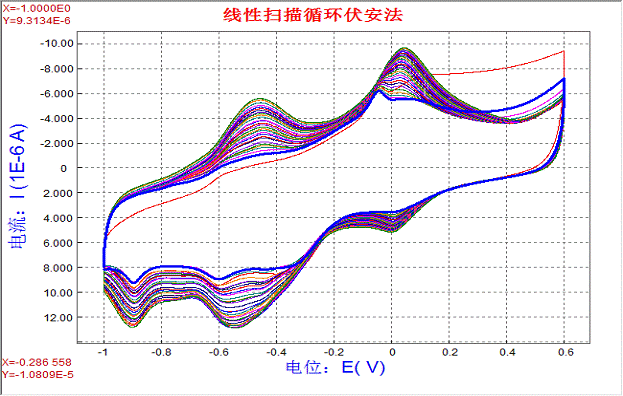 由測量結(jié)果可知,氧化峰電位為Ep2=277mV,峰電流為ip2=5.596591′10-6A;還原峰電位是Ep1=203mV,峰電流是ip1=5.568737′10-6A。氧化峰還原峰電位差為74mV,峰電流的比值為:ip1/ip2=1.005≈1。由此可知,鐵氰化鉀體系(Fe(CN)63-/4-)在中性水溶液中的電化學(xué)反應(yīng)是一個(gè)可逆過程。(注:由于該體系的穩(wěn)定,電化學(xué)工作者常用此體系作為電極探針,用于鑒別電極的優(yōu)劣。)